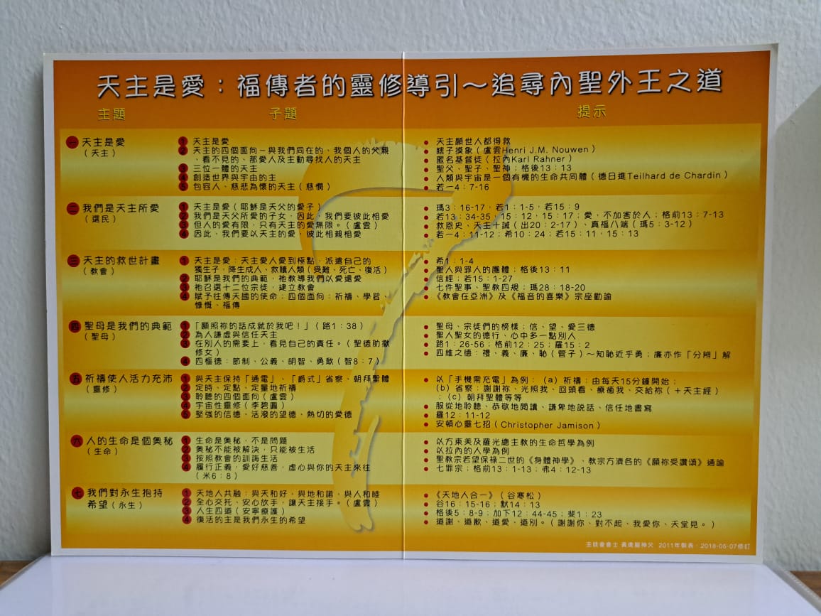 神师黄进龙神父特别为这一次的避静内容,给予我们许多灵修上的导引。他使用七个灵修主题给大家分门别类,不仅让我们更系统化地在脑海中建立了七个抽屉,让讯息更明确分类,也让我们从中建构一个扎实的灵修基础。