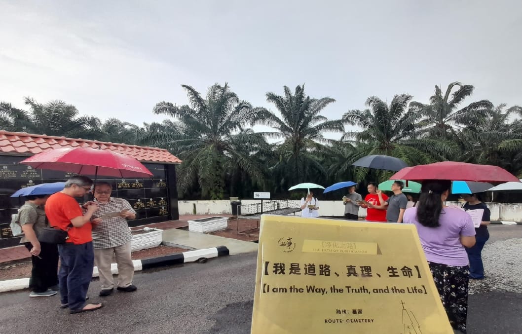 最后一天,我们到Ayer Salak的圣玛利亚堂朝圣以及参加感恩祭,之后在后山墓园走《净化之路》。黄神父幽默地告诉我们,但丁在地狱篇说了一句名言:“进来者,必放弃希望(Lasciate ogni Speranza, voiche’ entrate)”。我们不妨在进入墓园的时候,告诉自己这一句话:“进来者,必‘看见’希望。”
